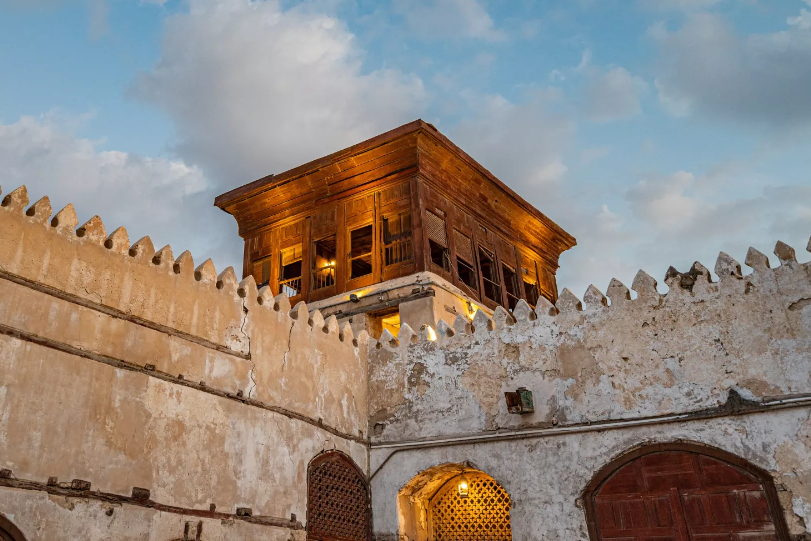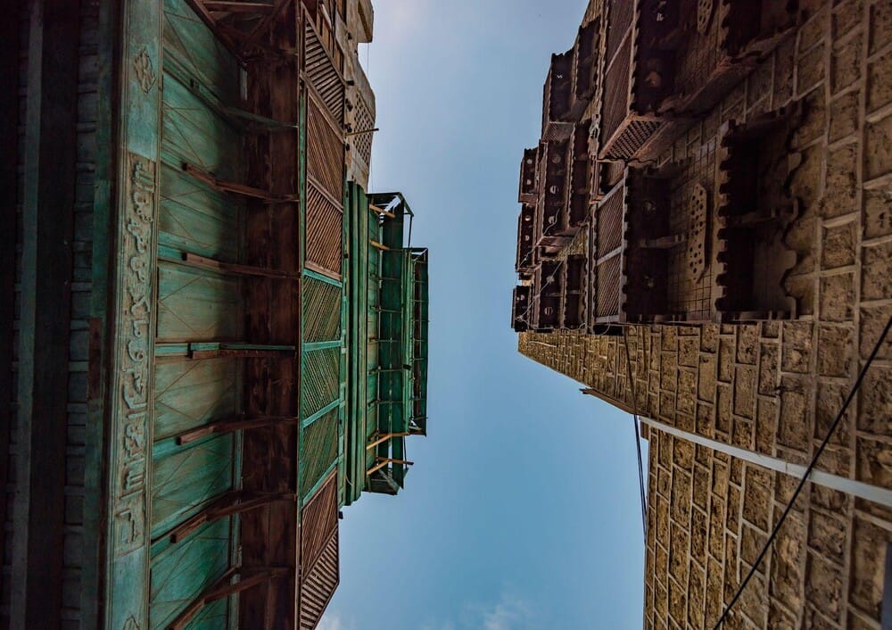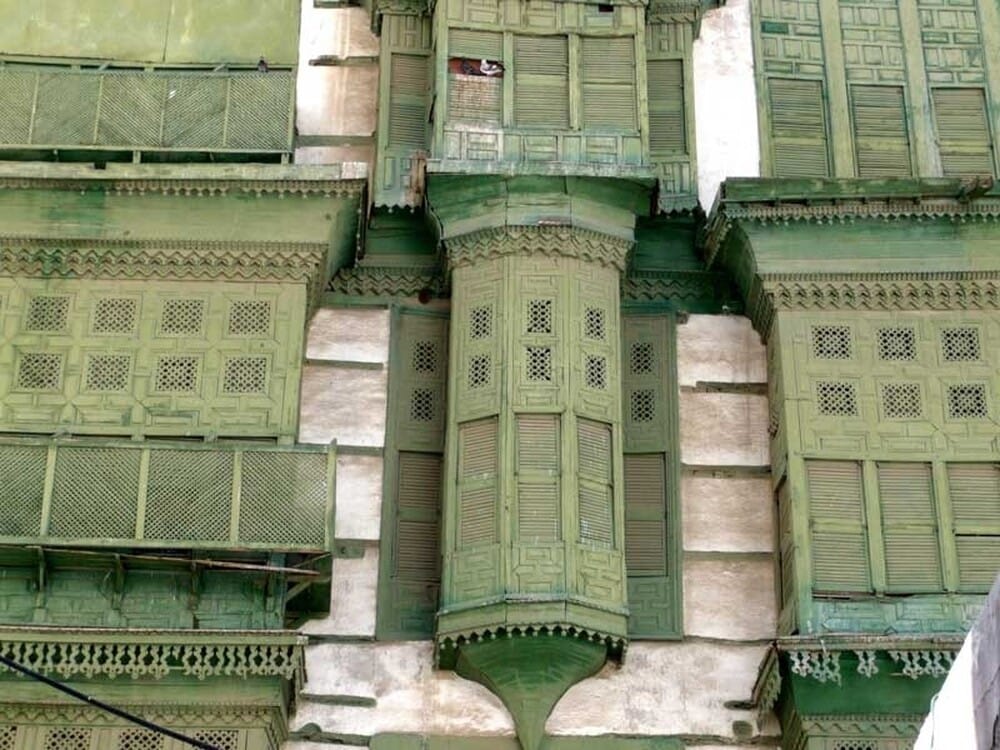 Above these walls sit the rawasheen (singular: roshan). These projecting wooden lattice windows are the most recognizable element of Al Balad’s skyline. Carved screens filter light, invite breeze, and protect privacy in the narrow streets. Many rawasheen are built from imported woods and assembled with intricate joinery, sometimes glowing with small colored glass panes.