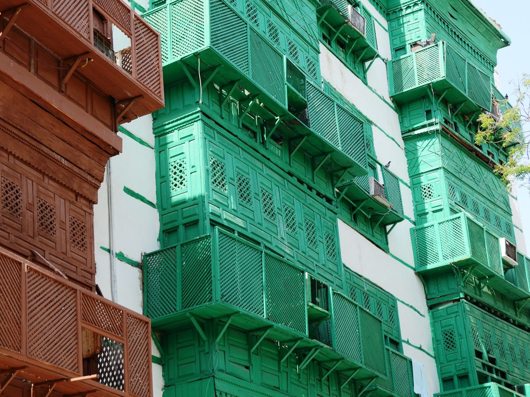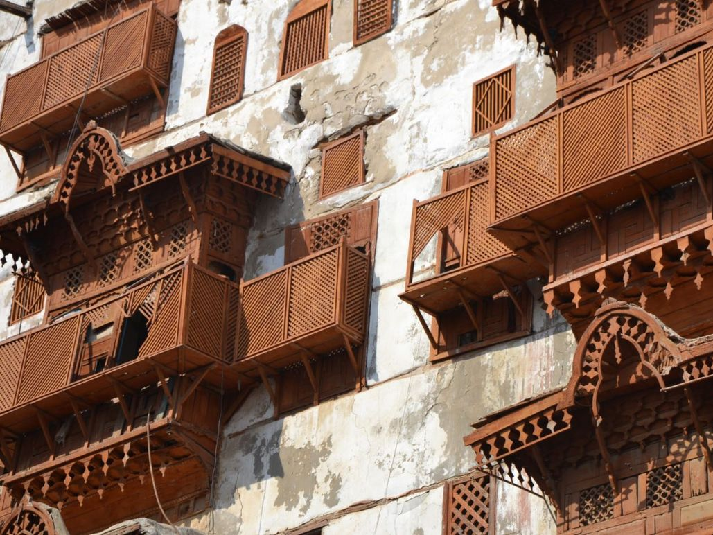 In the old heart of Jeddah, the buildings do something unusual. They do not hide their age. Coral stone shows through the plaster. Wooden windows lean over the street, heavy with carved detail, watching people pass below.