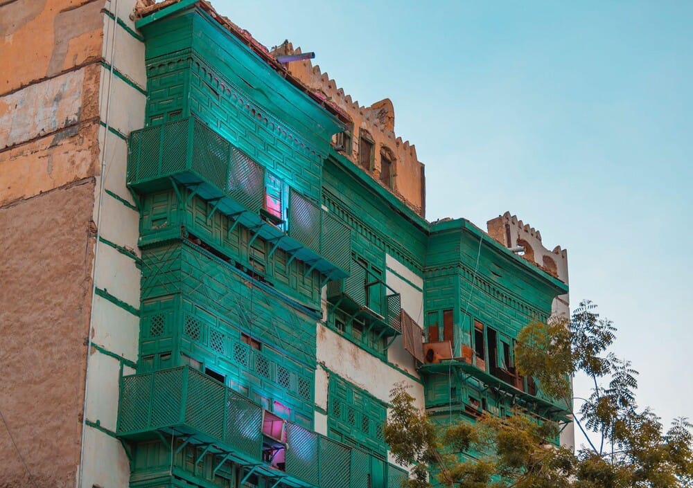 Al Balad is often described as “old Jeddah,” but its foundations tell a stronger story. Many of its historic houses were literally built from the sea. Their walls use coral stone blocks quarried from nearby reefs, bound with lime and mud, then washed in pale plaster. Coral stone is not just beautiful. It is practical. Thick walls help keep interiors cooler and let the building “breathe” in the coastal humidity. Light-colored finishes reflect the sun, creating natural comfort long before air-conditioning arrived.