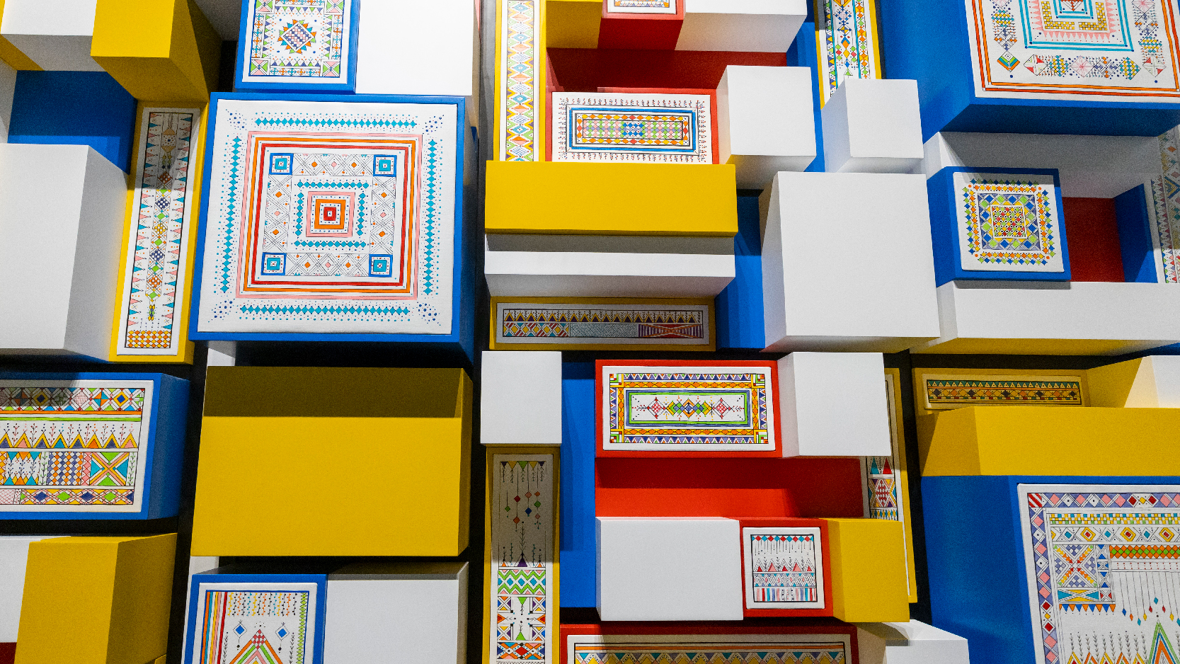 Bold sadu geometries, leatherwork for travel gear, carved doors and mandusah chests. Color palettes tend toward strong contrasts suited to desert light.