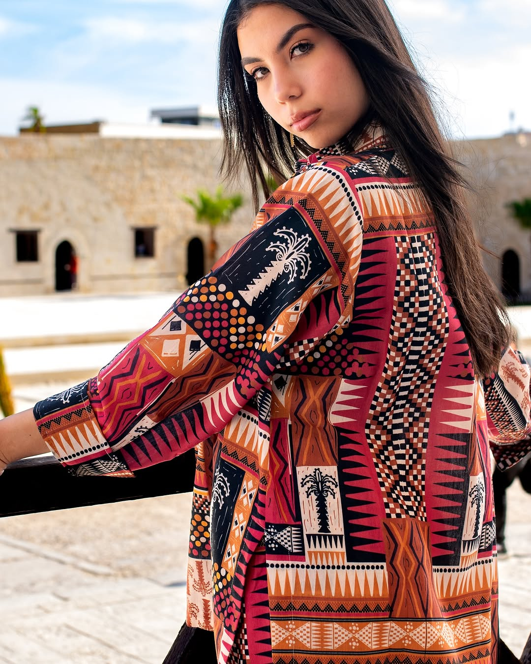 A classic sadu pattern is built through repetition. Stripes, triangles, dots, stepped forms, and geometric bands appear in carefully arranged sequences that feel both disciplined and expressive. Color plays a major role in shaping the identity of each textile. Red, black, white, orange, and green are among the shades often associated with Al sadu, creating a vivid contrast against the muted tones of the desert environment. Together, color and geometry give the sadu pattern its bold character.