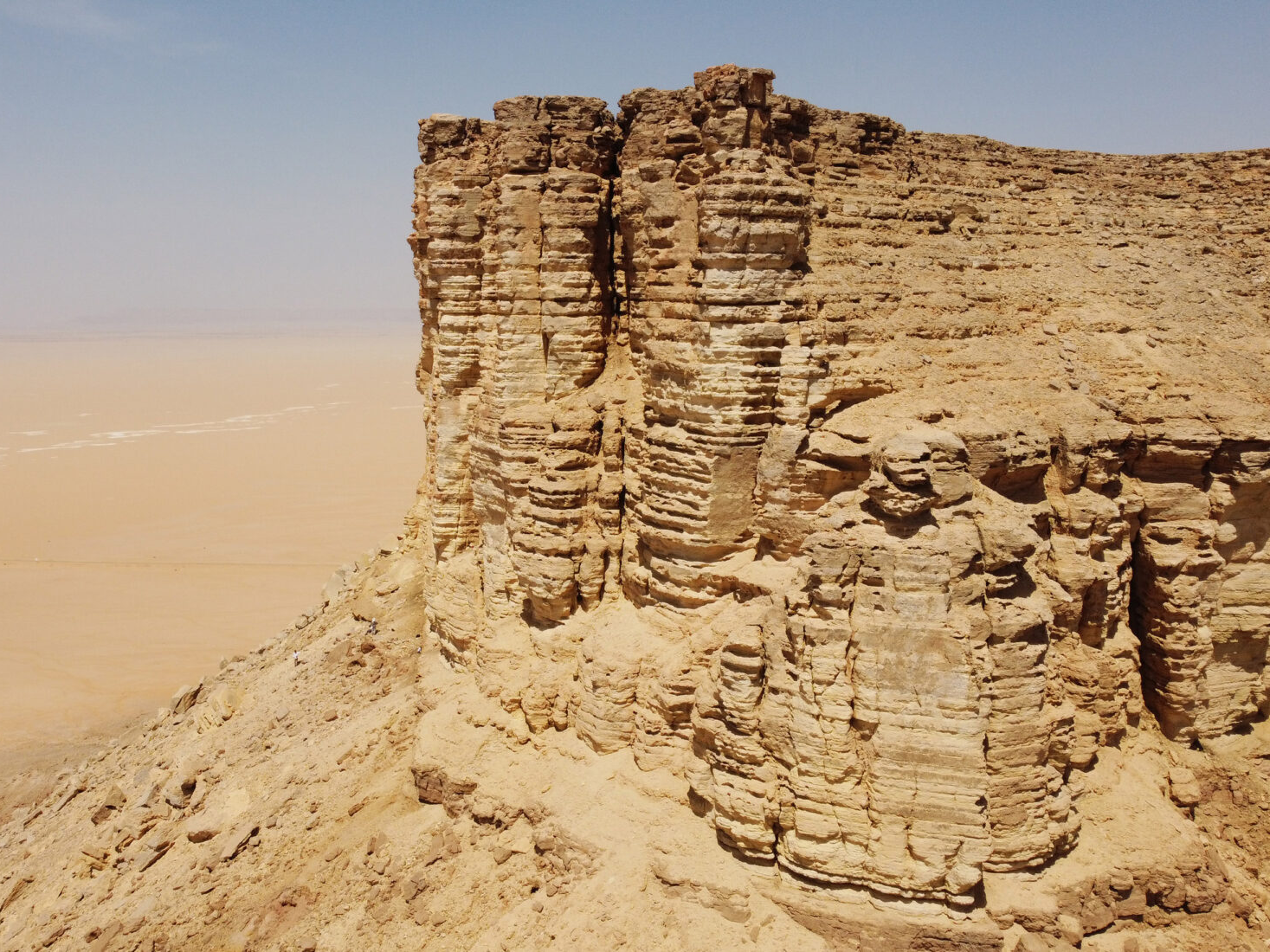 Aerial view of Qaryat al-Faw ruins and nearby cliffs, showing the former Kindah capital’s role as a key stop on the incense trade route in central Arabia.