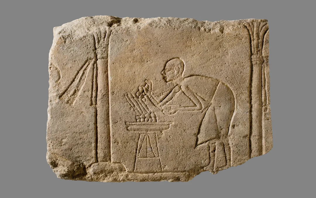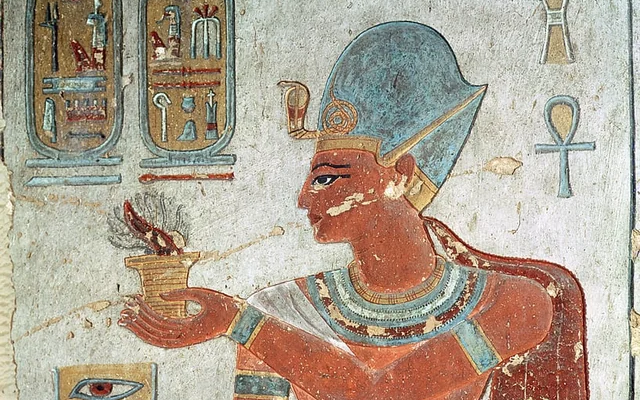 Ancient Egyptian depictions of incense rituals: on the left, a pharaoh offering burning incense; on the right, a carved limestone scene showing a figure tending incense on an altar.