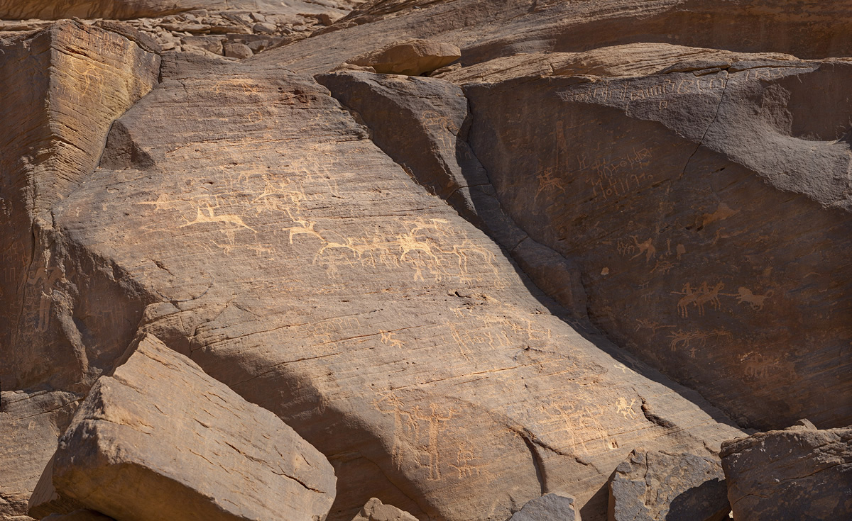 Carvings and inscriptions at Ḥimā span thousands of years. The earliest layers include hunting scenes and large fauna, while later layers introduce cavalry, prayers, and early Arabic names. This long arc means Ḥimā does not represent a single era or style. It is a stack of eras, formed by repeated visits to the same life‑giving places.