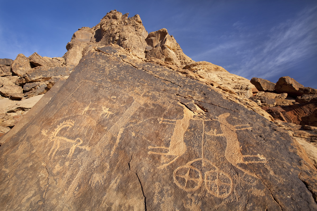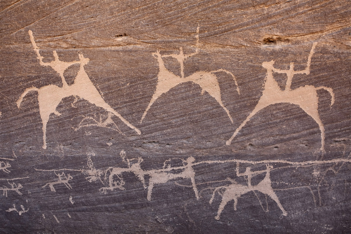 The result is a chain of rock panels spread across the desert. Some stand alone on ridge faces, while others cluster like pages in a book. By looking at the landscape, you can understand the art. Open plains often show animal scenes, while shaded cliffs carry denser carvings of names, prayers, and stories. Geography guided movement, and that movement shaped memory.