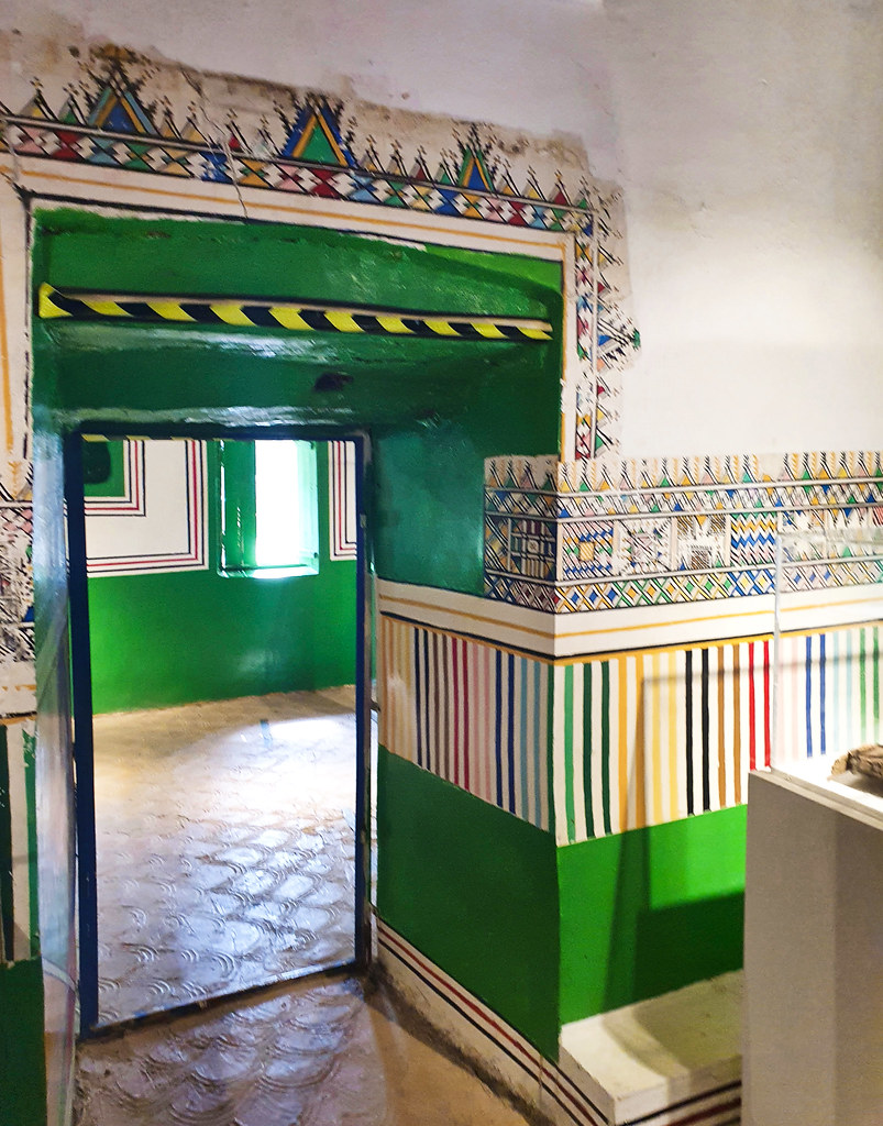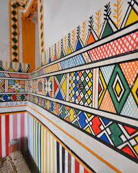 This traditional wall painting is more than decoration. It tells stories of the home, the women who live there, and the surrounding landscape symbolically expressed through triangles, zig-zags, and vibrant color palettes.