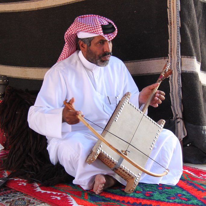 The Rababah (often called rebab) is a one- or two-string bowed instrument strongly associated with Bedouin communities in northern Saudi Arabia. It's a “primitive” yet central instrument, historically accompanying nomads at their gatherings and celebrations and remaining important in national festivals today.