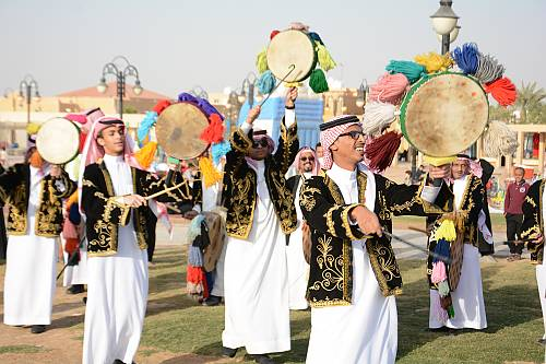 Traditionally performed by men standing shoulder to shoulder, participants carry swords and move in synchronized steps while verses of poetry are recited. The poetry often speaks of loyalty, courage, leadership, and the history of the homeland. Large drums set the rhythm, creating a steady pulse that guides both the movement and the chanting. Ardah was historically associated with moments of mobilization and solidarity. Today, it carries that same spirit, but as a cultural expression of national identity rather than conflict.