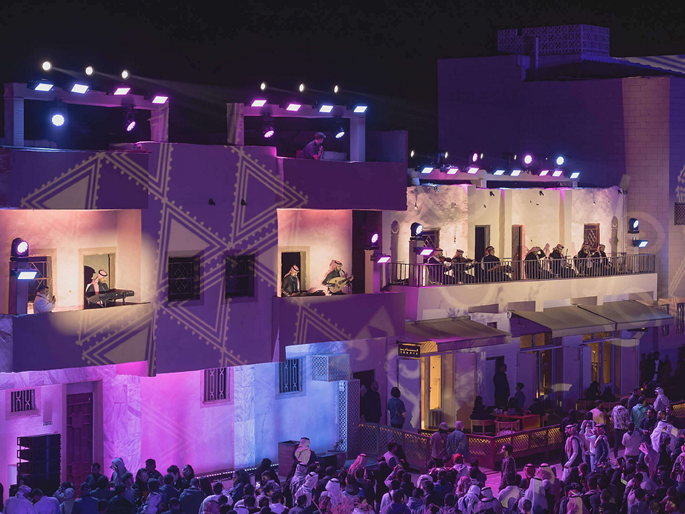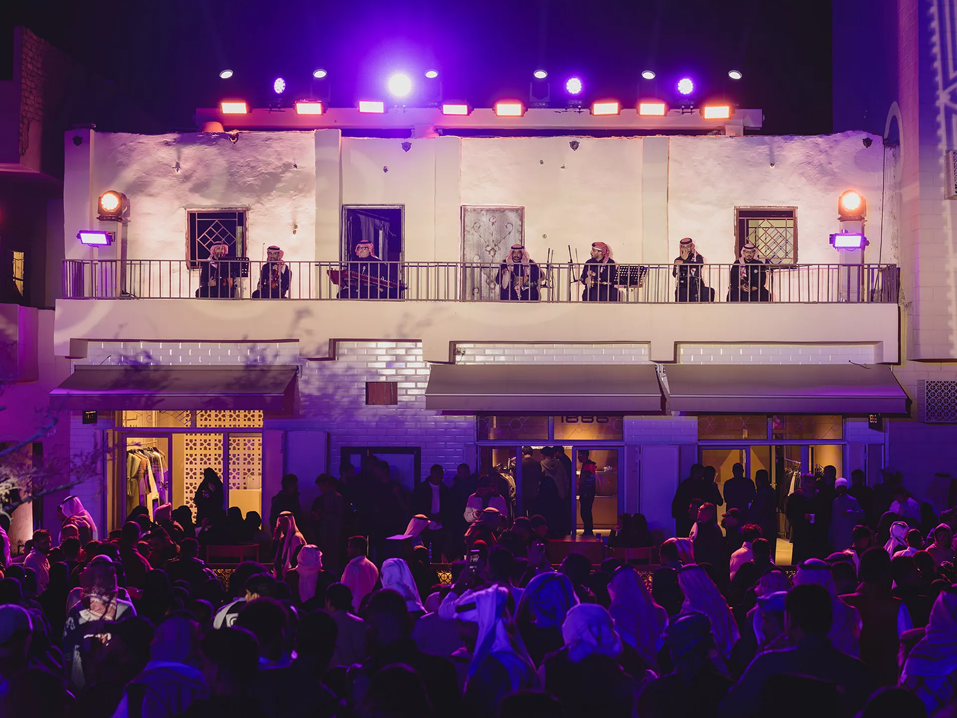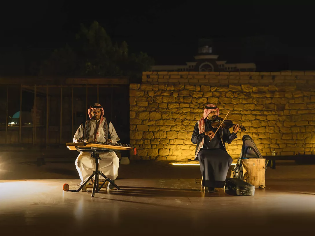 During Winter at Tantora, part of AlUla’s nightlife is free and completely outdoors. Shorfat Tantora transforms the streets of AlJadidah Arts District and AlManshiyah Plaza into a musical corridor. Musicians perform from balconies and raised platforms, looking out over Incense Road and nearby squares. Crowds wander between cafés and galleries while: